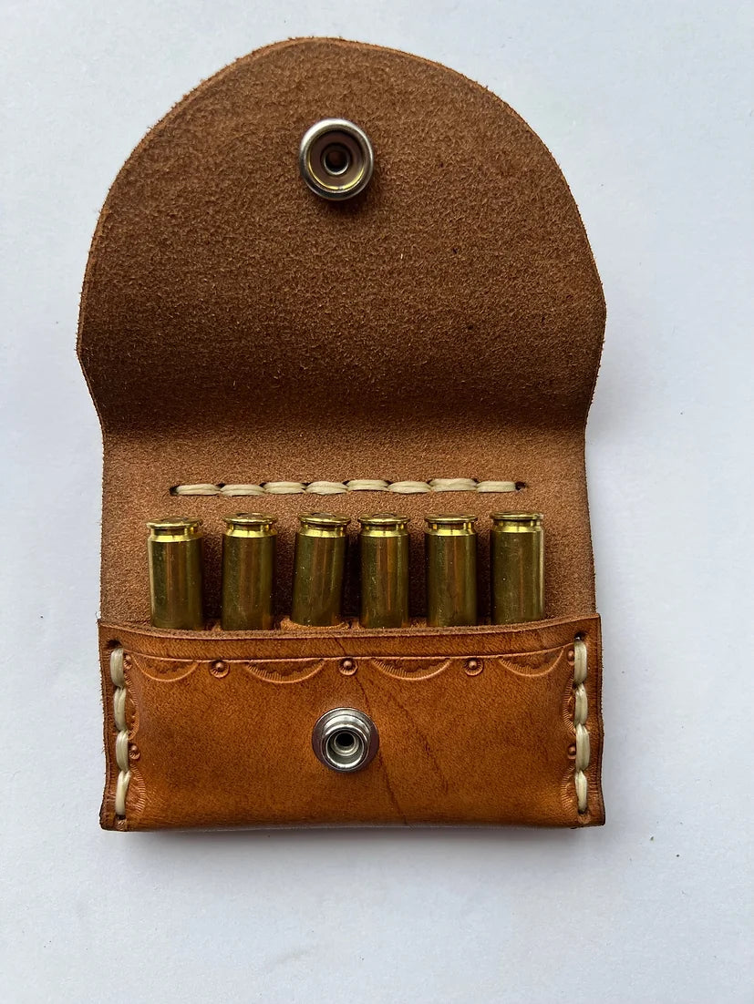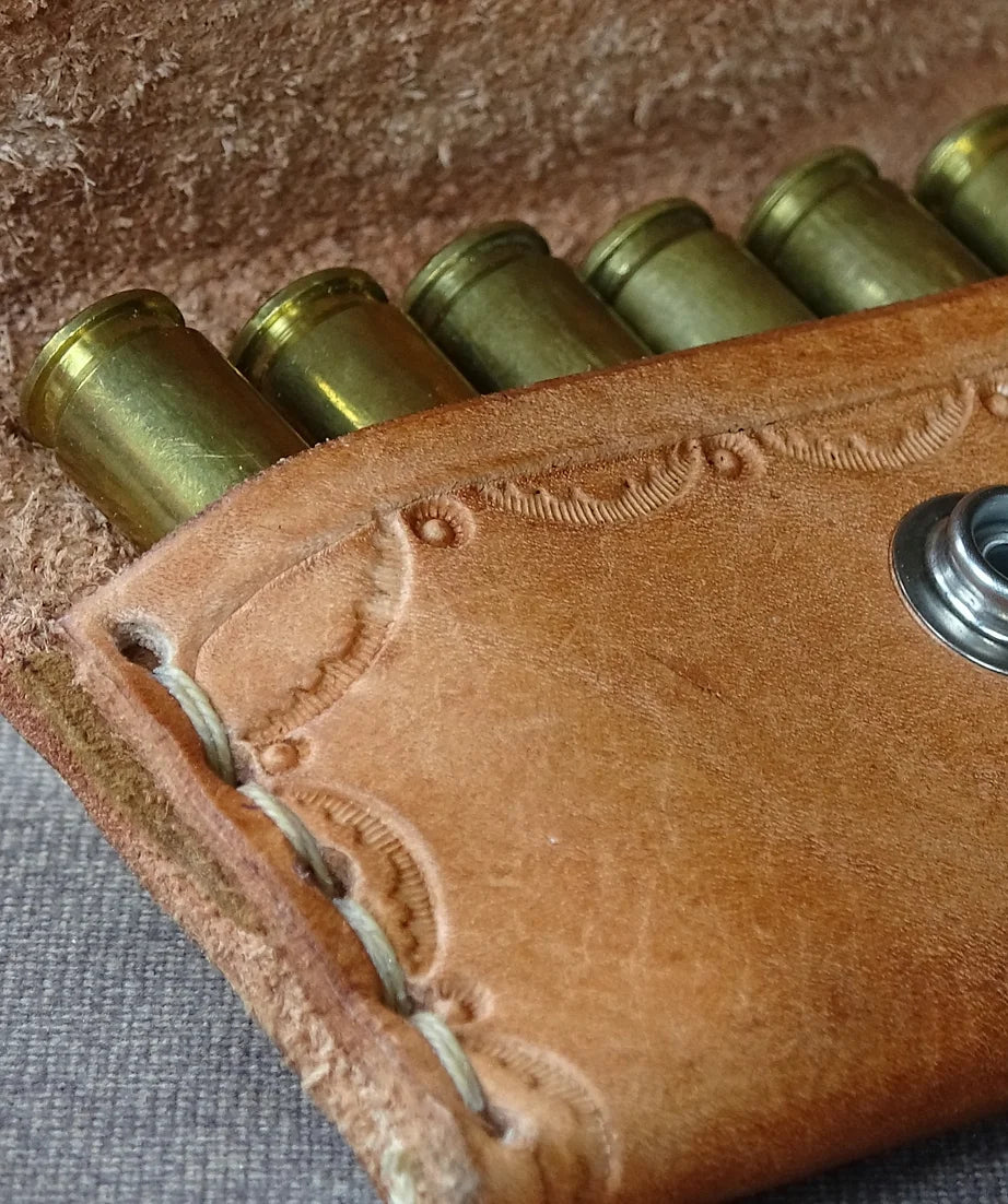 Not pumped to wear a plastic/velcro factory masterpiece? How about a handmade, 100% leather, built so you can pass it along to your kids kind of product? This leather ammo belt secures an extra 6 shells at your side. Made for .243/.308/30-30 and 7mm rem mag/30-06/300Mag but may also fit rounds from other similar calibres. Julia has just finished the much requested 45-70 which holds 5 shells! Please Note - All leather used is from real cattle and therefore may have scrapes, cuts, scars, brands, etc.
